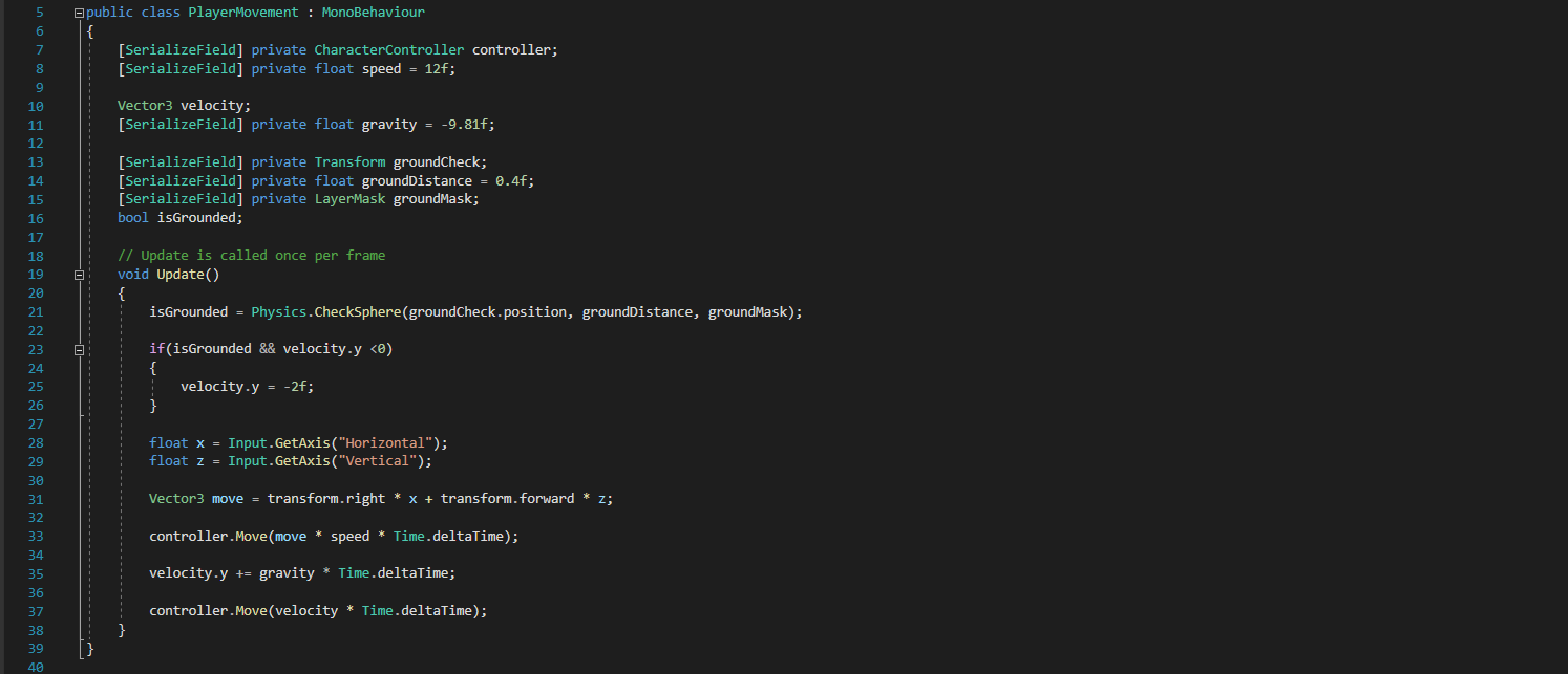 We wanted to have a playable character so one of the first things that got done was making a character movement script, wich u can see here below